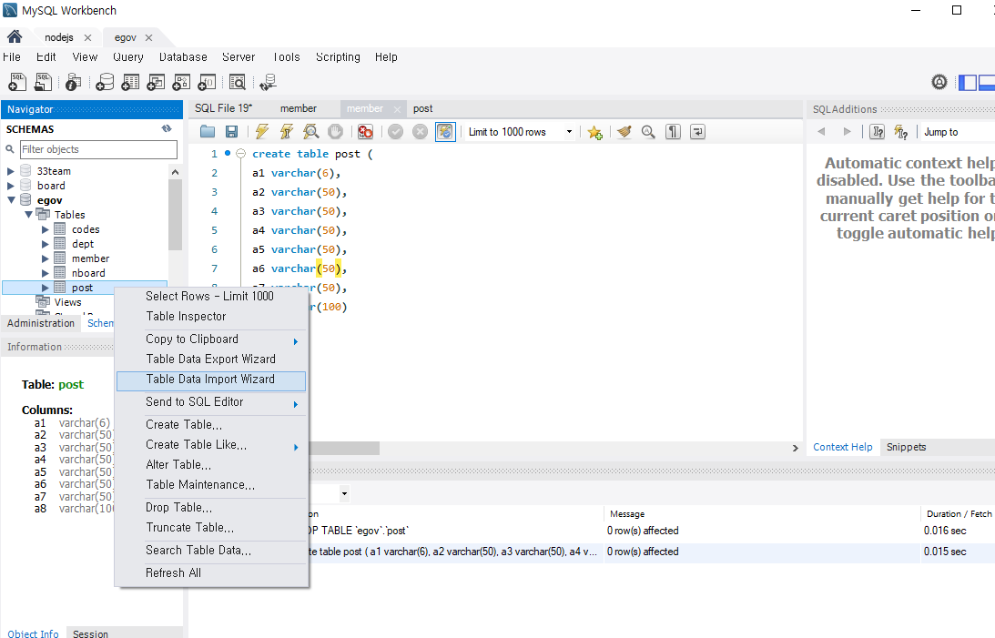 1. 데이터를 삽입할 테이블이 속해있는 스키마(DB)의 오른쪽을 클릭한 후 Table Data Import Wizard를 클릭