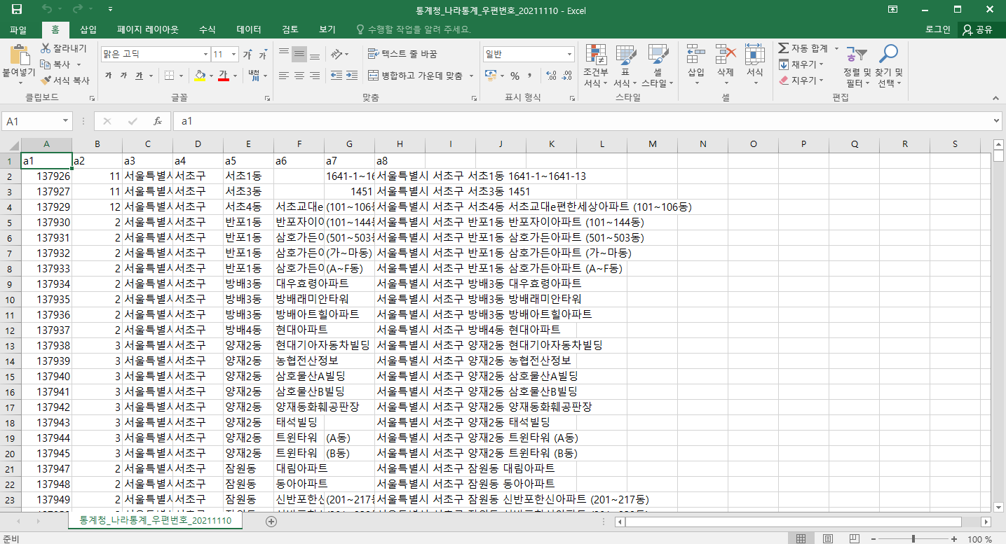 우편번호, 우편번호순서, 도이름, 시군구이름, 읍면동이름, 리건물이름, 동호, 최초등록일, 최초등록자, 최종수정일, 최종수정자, 등록일, 수정일시, 전체주소