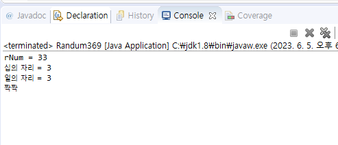 // 3. 랜덤 숫자 중에서 3이나 6이나 9의 개수가 1개면, 짝을 출력한다.