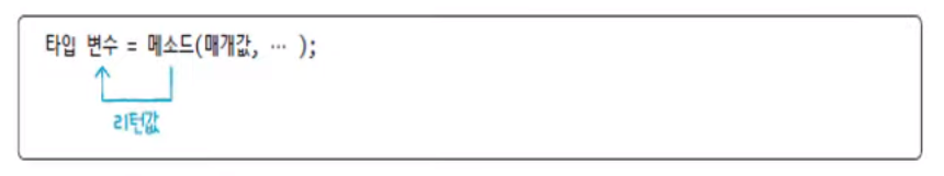 타입 변수 = 참조변수.메소드( 매개값, ... ); // 리턴값이 있고, 리턴값을 받고 싶을 경우