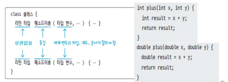 매개 변수의 타입, 개수, 순서가 다르게 선언되어야 함