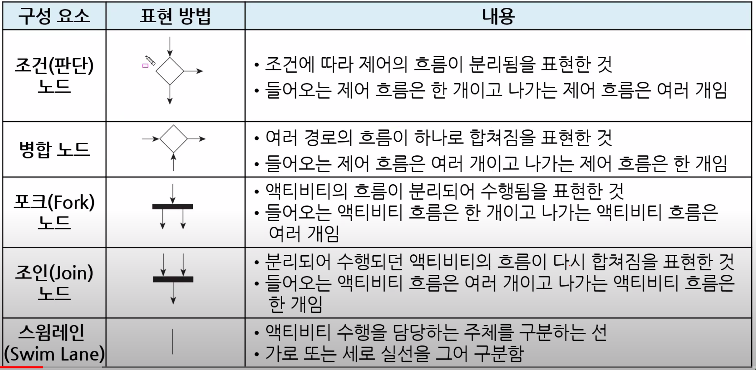 - 활동(Activity) 다이어그램 : 객체의 처리 로직이나 조건에 따른 처리의 흐름을 순서에 따라 표현