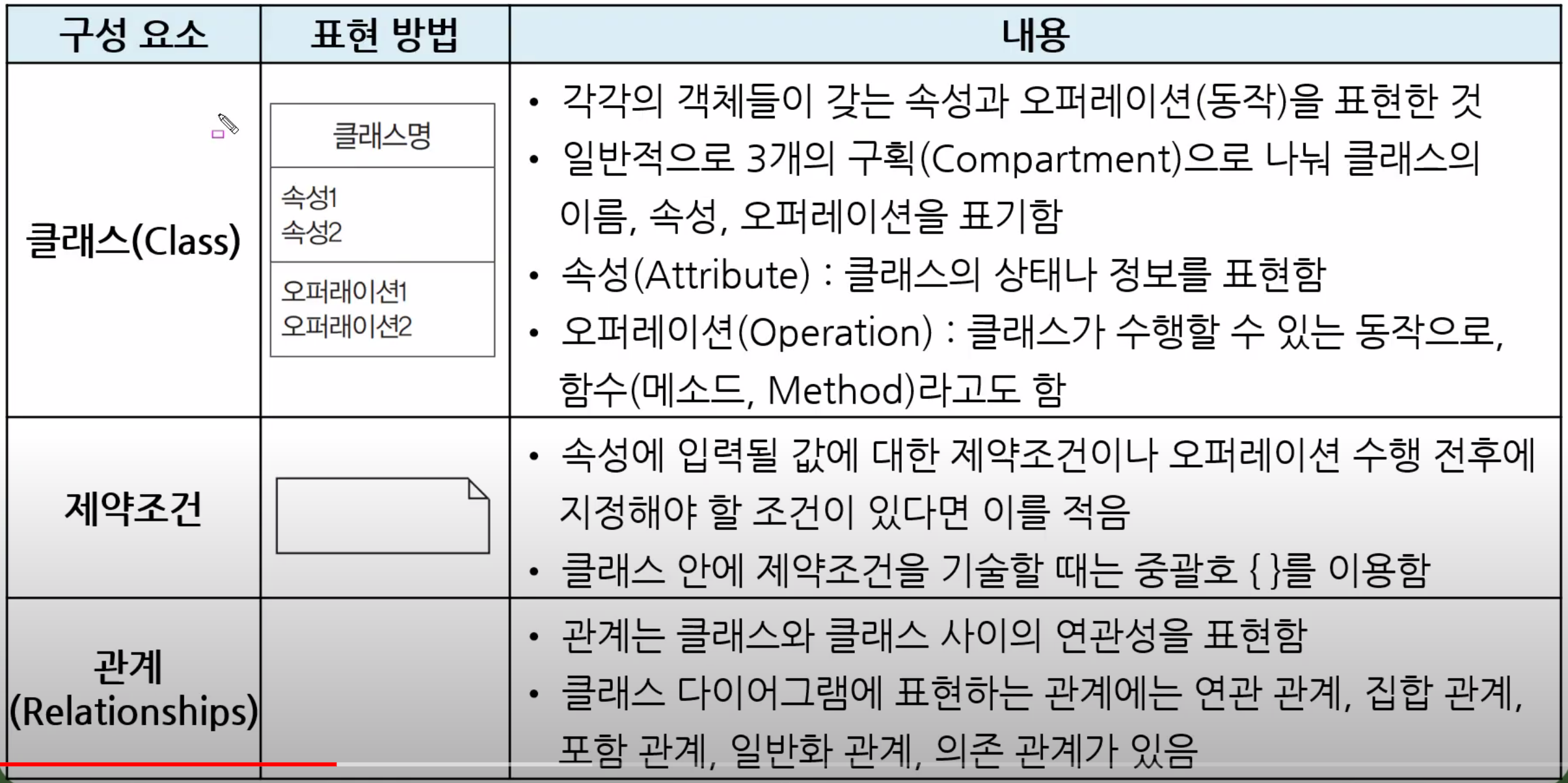 - 클래스 다이어그램 : 클래스와 클래스가 가지는 속성, 클래스 사이의 관계를 표현함