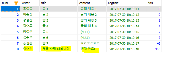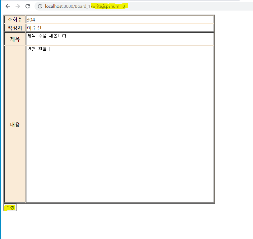 write.jsp에서 글 제목, 내용 수정 후 수정 버튼 클릭하면 update.jsp로 이동해서