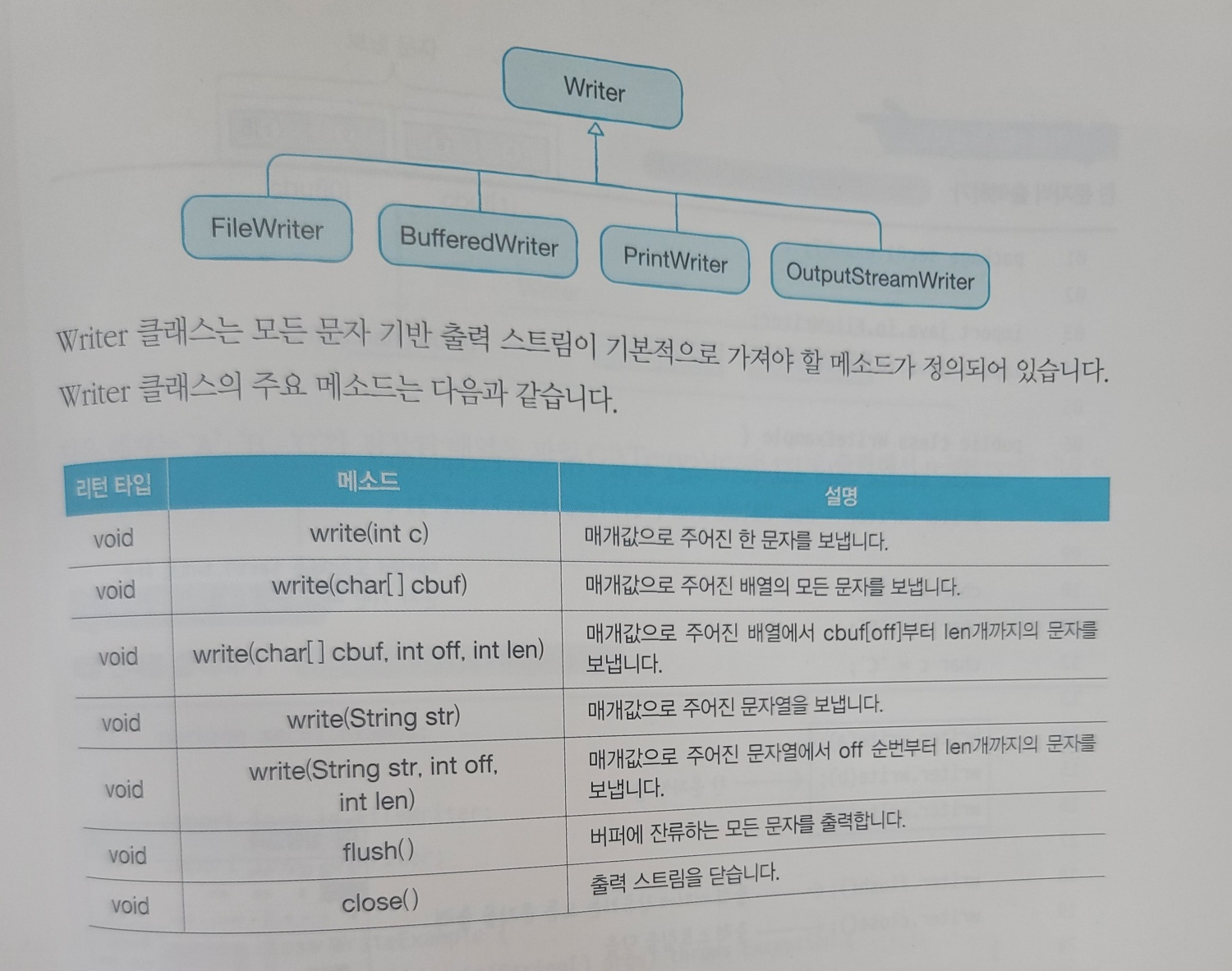 문자 기반 출력 스트림의 최상위 클래스로 추상클래스이다. 모든 문자 기반 출력 스트림 클래스는 Writer 클래스를 상속