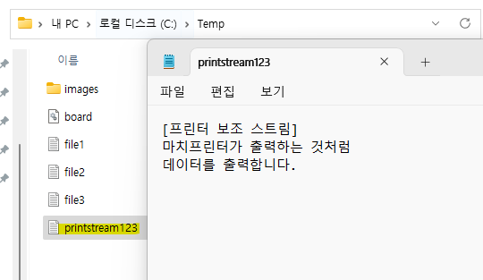 PrintStream과 PrintWriter는 프린터와 유사하게 출력하는 print(),println() 메소드를 가지고 있는 보조 스트림이다.