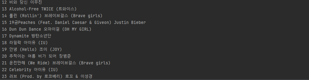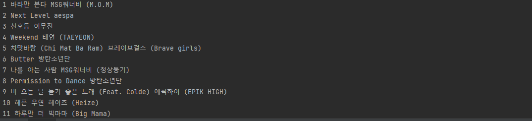 musics = soup.select(' ') 부분에 동일한 부분까지 #body ~ tr 까지 복, 붙