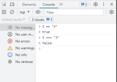 3 === "3" 피연산자도 같고 자료형도 같으면 true