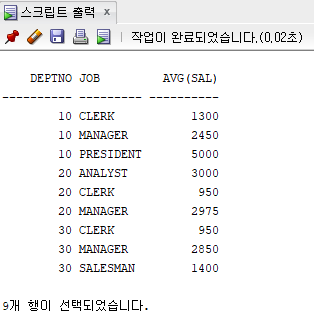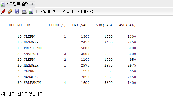 SELECT DEPTNO, JOB, COUNT(*), MAX(sal), SUM(sal), AVG(sal)