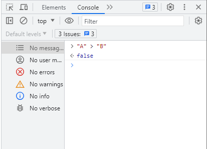 "A" > "B" A의 아스키값(65), B의 아스키값(66) 비교