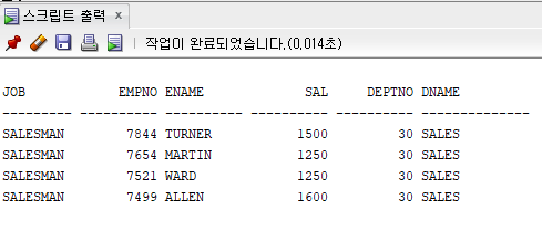 select e.job, e.empno, e.ename, e.sal, d.deptno, d.dname