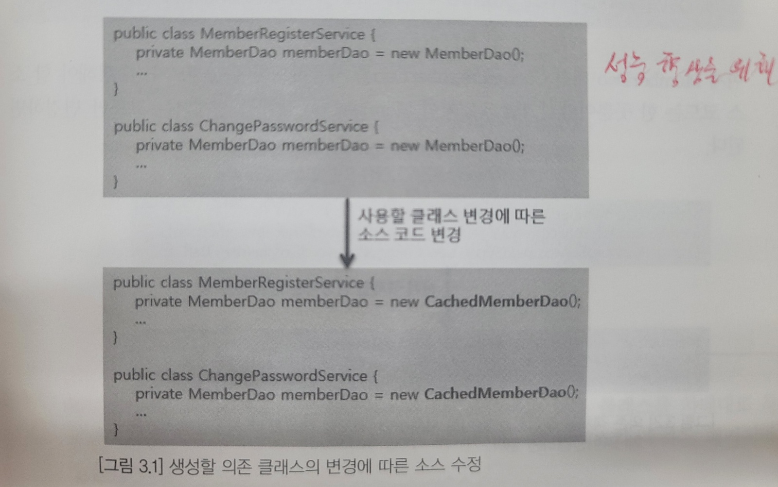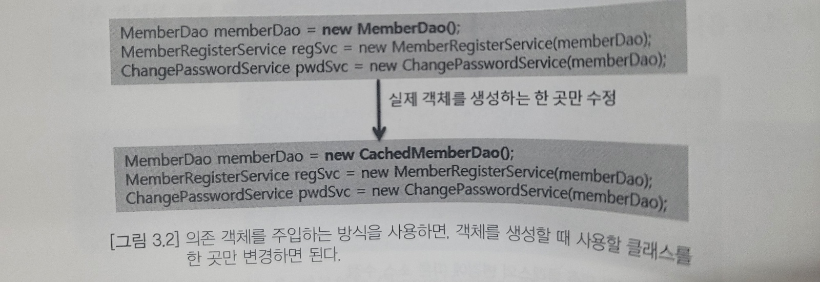 의존하게 되면 MemberDao클래스의 insert() 메서드의 이름을 insertMember()로 변경하면 이 메서드를 사용하는 MemberRegisterService 클래스의 소스 코드도 함께 변경 된다. 이렇게 변경에 따른 영향이 전파되는 관계를 의존한다고 표현 한다. 클래스 내부에서 직접 의존 객체를 생성하는 것이 쉽긴 하나 유지보수 관점에서 문제점을 유발할 수 있다.