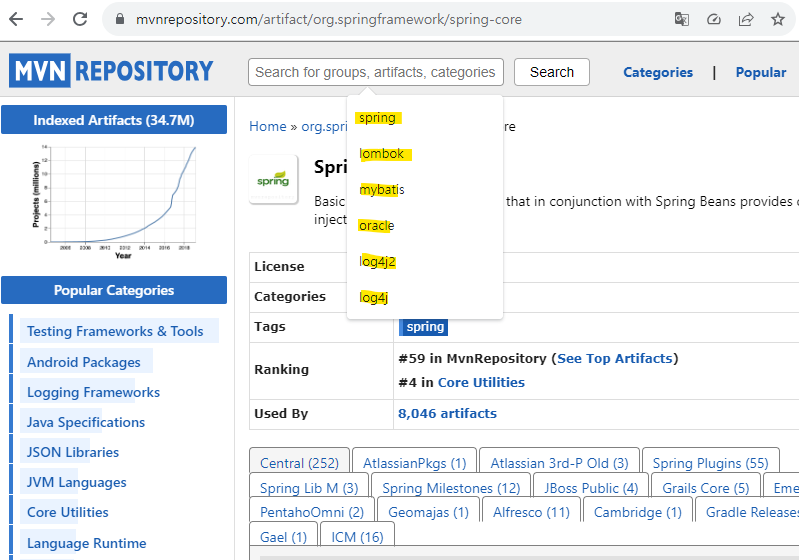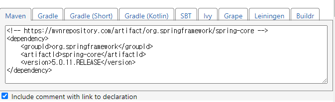 Maven, gradle 환경설정에 필요한 jar <dependency> 확인 가능