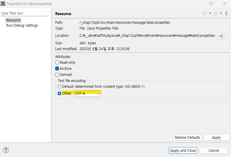 Properties에서 밑에 이미지 처럼 UTF-8 설정