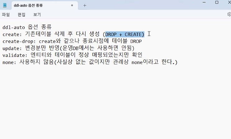 auto= create 하면 기존 테이블 삭제 후 다시 생성되기떄문에 데이터가 전부 사라짐 ( 테스트 할 때 사용 )