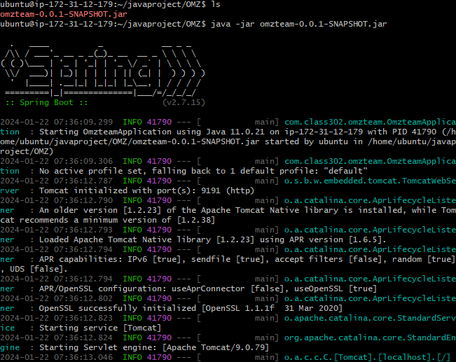 10. java -jar omzteam-0.0.1-SNAPSHOT.jar ( jar 파일 실행 )