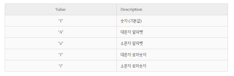 type 어트리뷰트를 사용하여 순서를 나타내는 문자를 지정할 수 있음