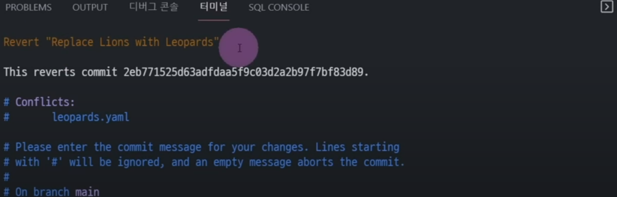 hint: "git revert --continue". ( 해당 명령어를 입력 해달라고 요청 하고 있음)