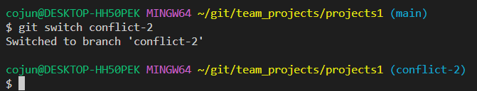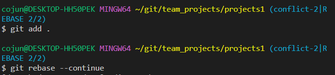 conflict-2에서 git rebase main로 리베이스 시도하면 충돌 발생
