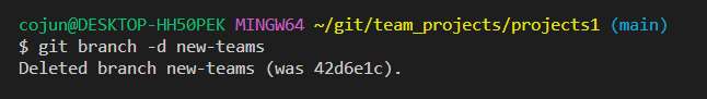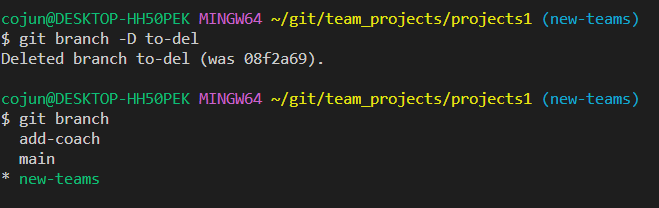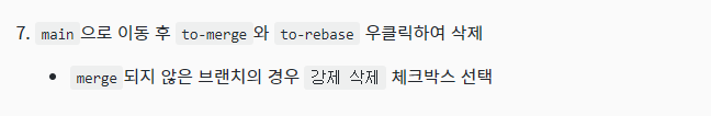 즉 다른 브랜치로 가져오지 않은 내용이 있는 브랜치를 지울 때는 강제 삭제