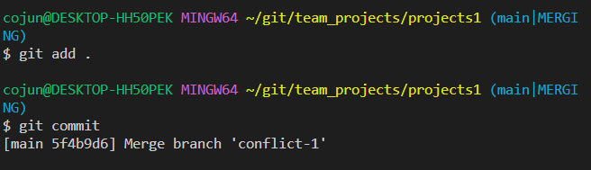 git merge conflict-1로 병합을 시도하면 충돌 발생