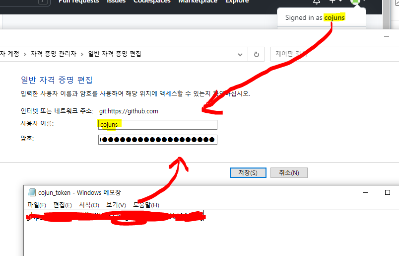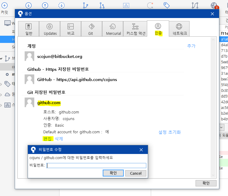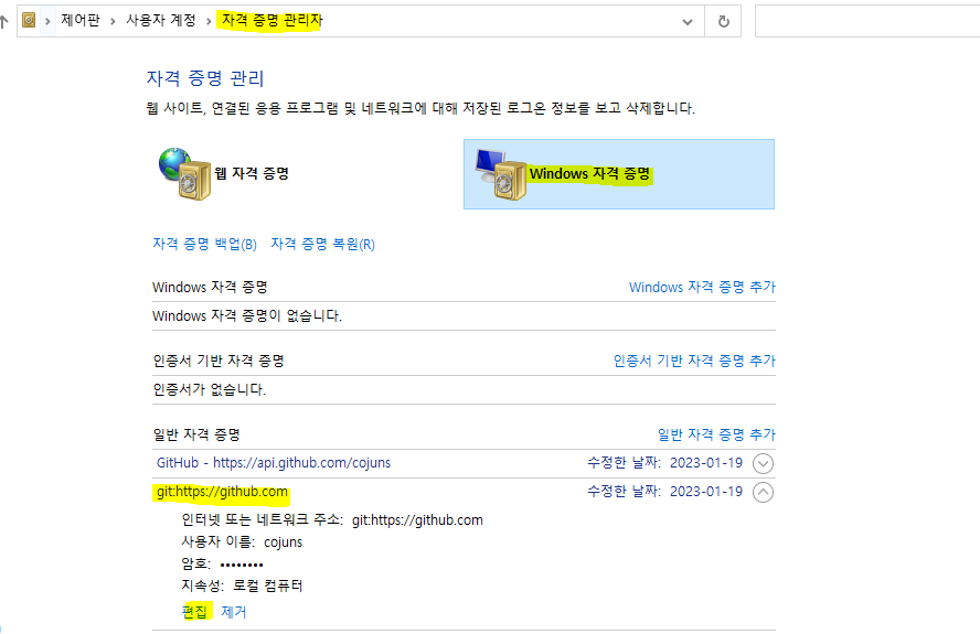 밑에 일반 자격 증명 github.com 클릭 후 편집 ( 없으면 해당 주소 추가 )