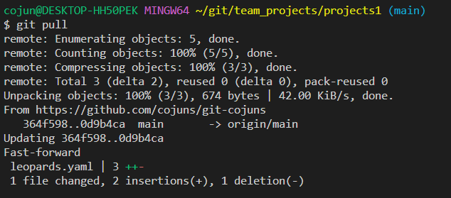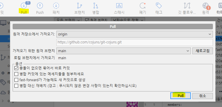 보통은 협업을 하고있는 인원이 push에서 올린 작업을 GitHub으로 부터 내 로컬로 다운 받는 용도로 사용