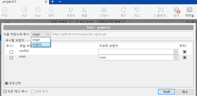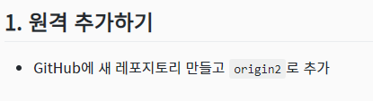 원격 저장소 이름에 흔히 origin 사용. 다른 것으로 수정 가능
