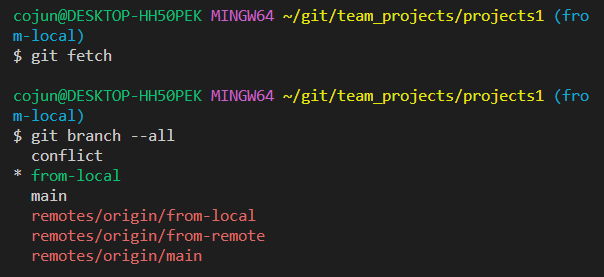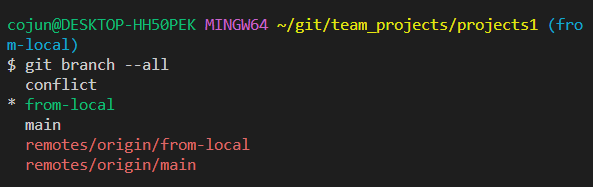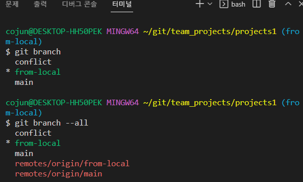 git branch --all : 로컬, 원격 브랜치 검색 가능