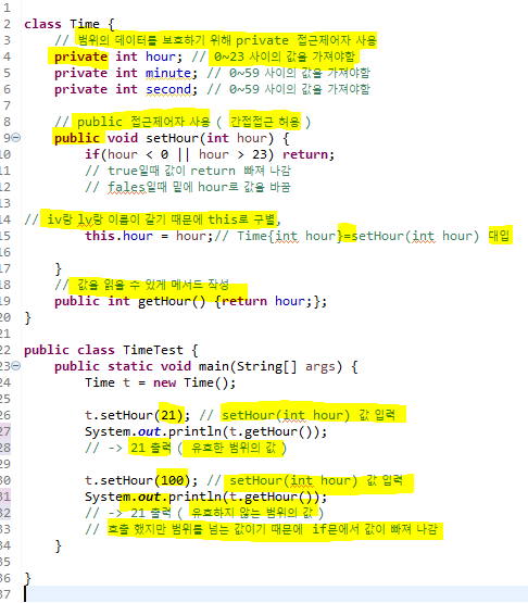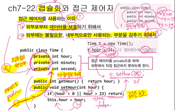 범위에 있는 값( ex_hour=0~23 )들로 변수들이 유지가 되야 되는데 = 대입연산자로 직접 접근 시 범위 외에 들어 값들을 막을 수 없음 ( public으로 접근제어자를 설정 해두면 외부로 부터 데이터 보호가 안됨 )