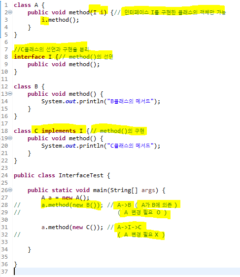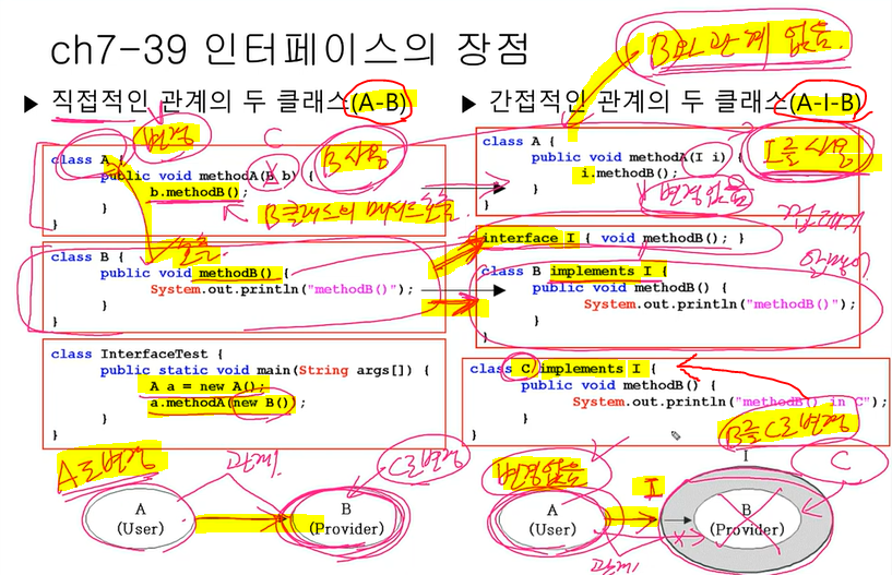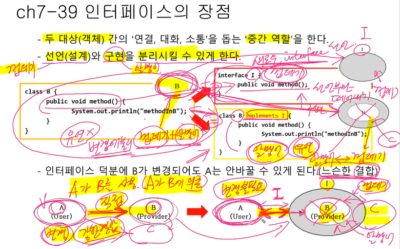 B에 인터페이스 O : A -> B 느슨한결합 상태, B를 C로 변경할라고 하면 B만 변경, A는 변경 X