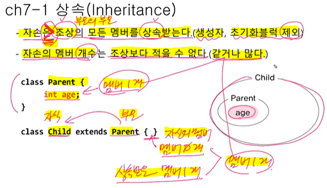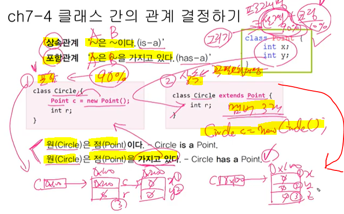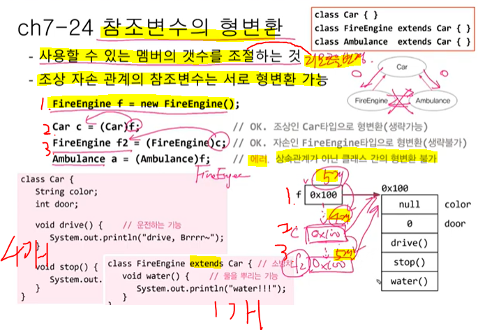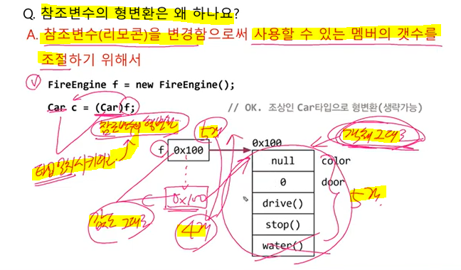 자손타입 <- 조상타입 ( 형변환 생략 불가 ), 5개 <- 4개 (증가) 안전x, 자손 f2 = ( 자손 )c조상;