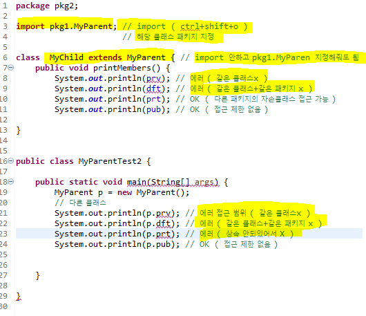 패키지 1, 패키지 2 구별하면서 접근제한 확인 하기