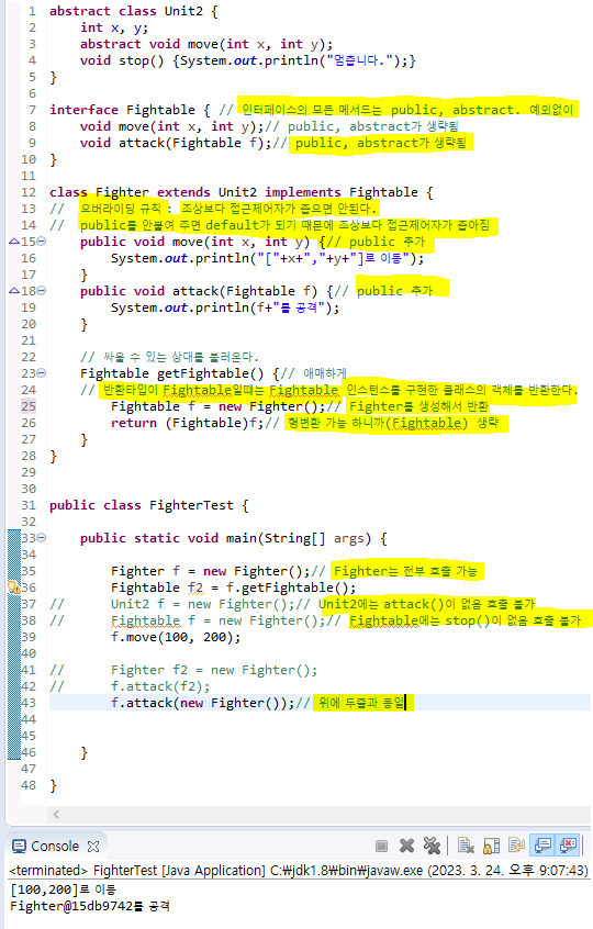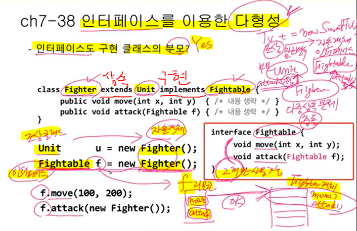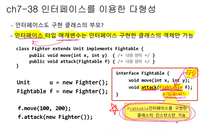 인터페이스 타입 매개변수는 인터페이스 구현한 클래스의 객체만 가능 ex)Fighter만 가능