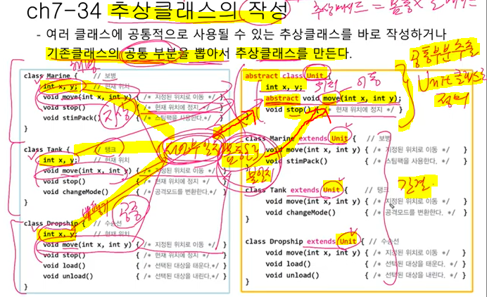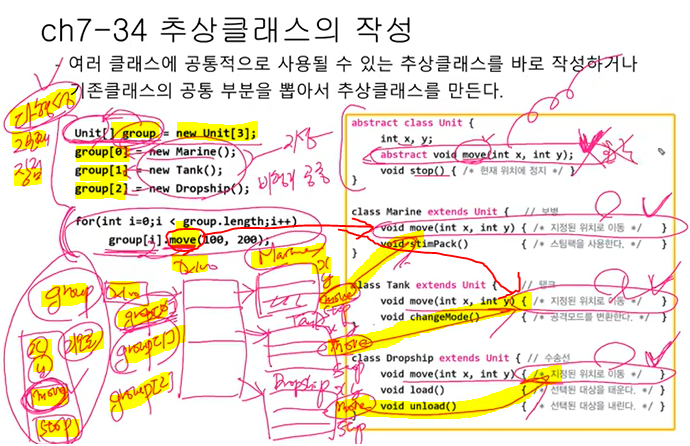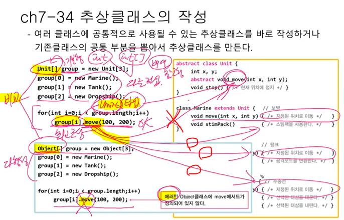 move(int x, int y) 선언부는 일치하나 각자 움직이는 방식{몸통}이 틀리니 일치 하는 선언부만 뽑아냄