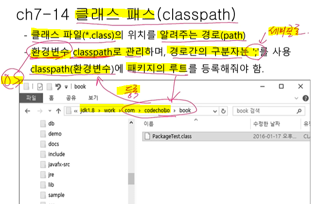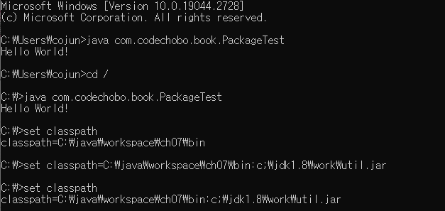set classpath=C:\java\workspace\ch07\bin;(세미콜론)c;\jdk1.8\work\util.jar