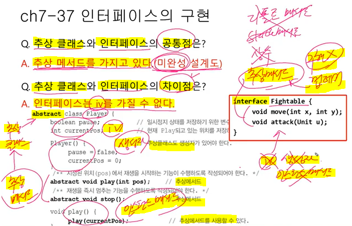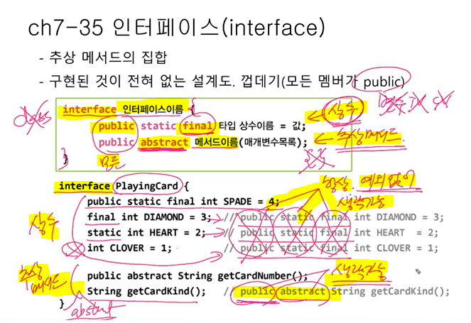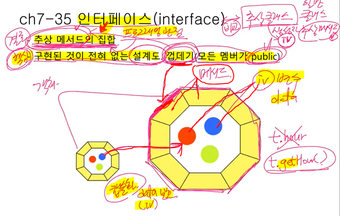인터페이스 : 추상 메서드만 가지고 있고 그외 나머지 것들은 부수적인것, 구현된게 아무것도 없는 것
