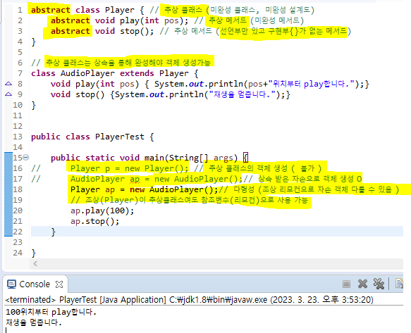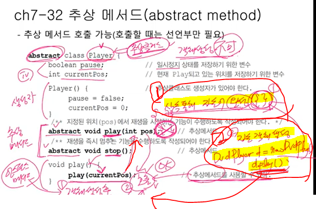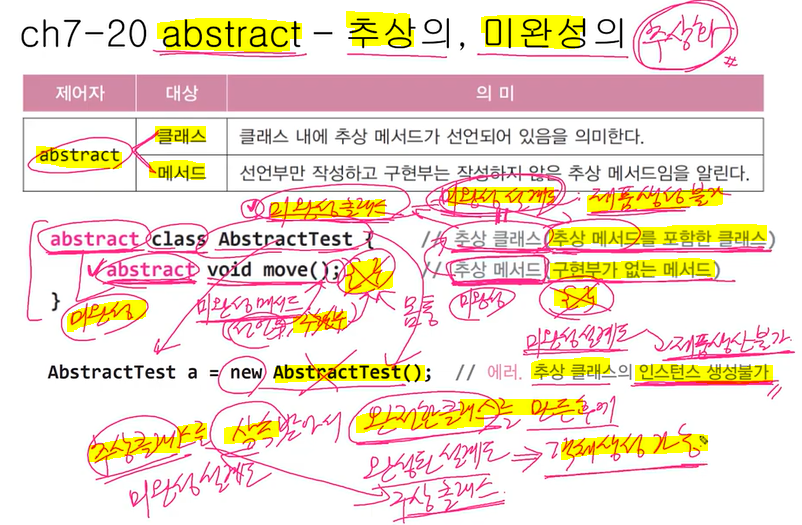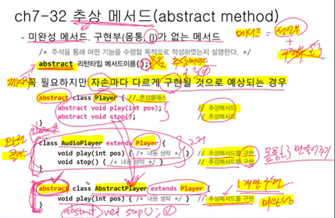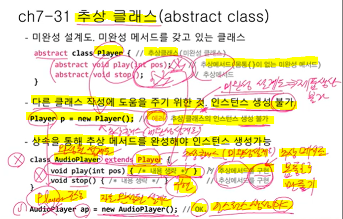 추상메서드 2개를 상속 받았는데 1개만 추상메서드를 구현→ 미완성 클래스 ( abstract 붙여줘야 됨 )