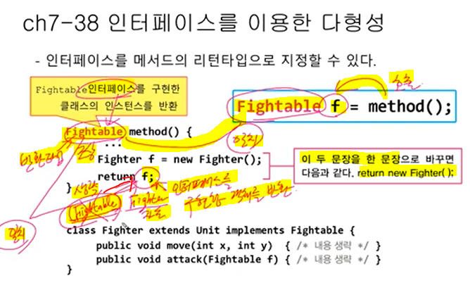 인터페이스를 메서드의 리턴 타입으로 지정할 수 있다. ex)Fighter만 가능