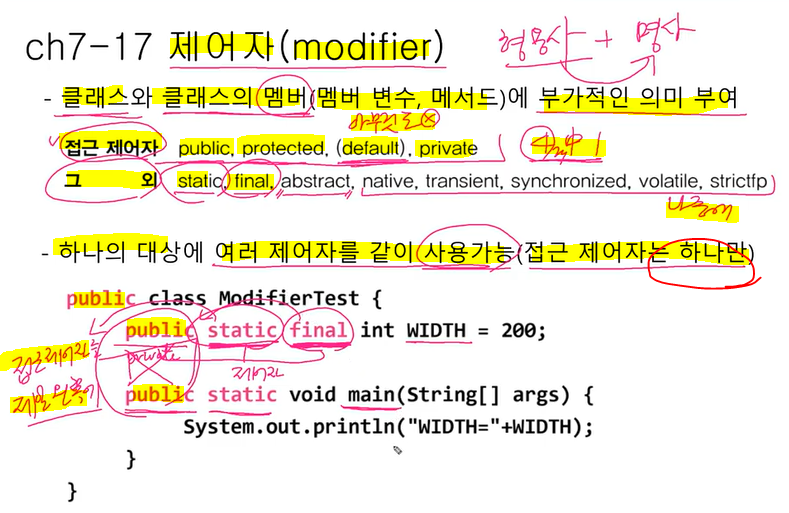 하나의 대상에 여러 제어자를 같이 사용은 가능하나 접근제어자는 하나만 가능