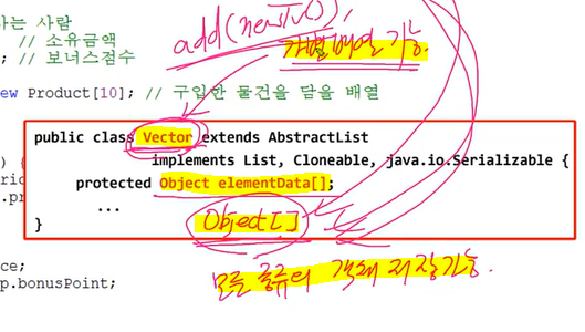 Object elementData[ ]; : Object[ ] 모든 종류의 객체 저장 가능, 최고 조상이기 때문에