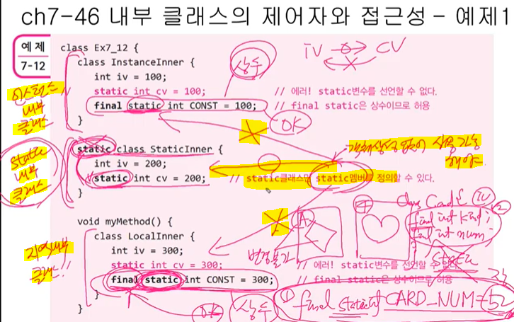 iv 경우 final int kind; ( static x ) : 카드마다 값이 달라야하지만 한번 값이 결정되면 변경 불가되야 한다.
