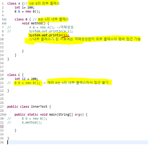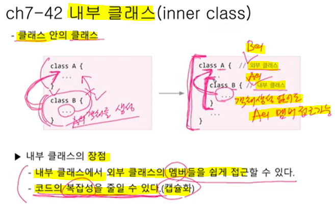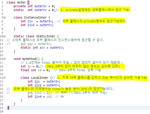내부 클래스는 외부 클래스의 private멤버도 접근 가능 ( 클래스 내에 있으니 )