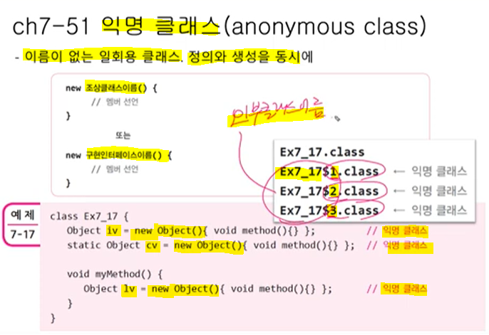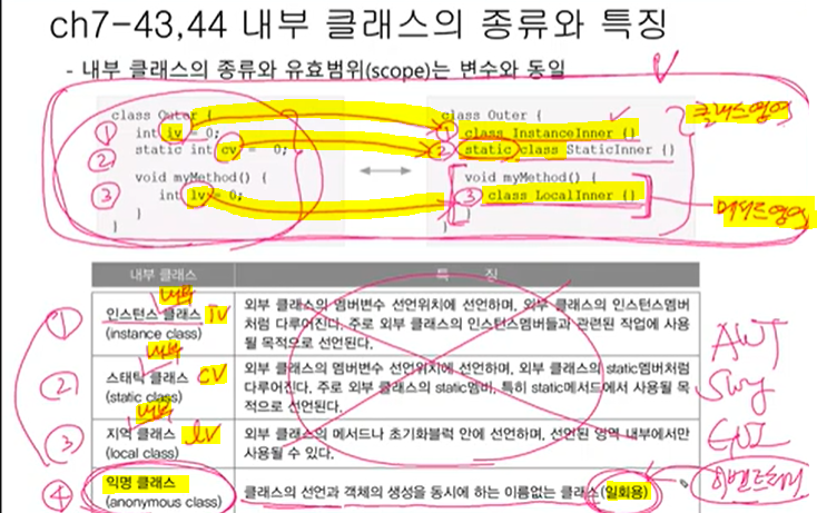 내부 클래스 종류는 변수(iv,cv,lv) 개념과 동일 iv, cv(static) -> 클래스 영역, lv ->메서드영역