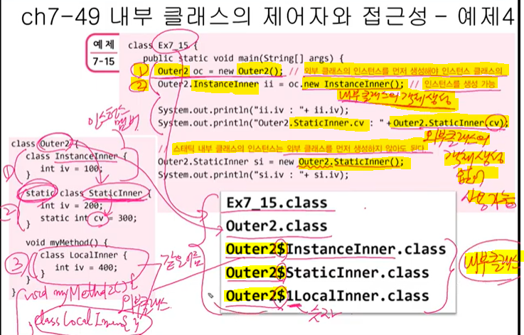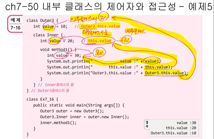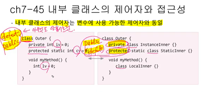 외부 class -> default, public만 가능, 내부 class -> 변수처럼 모든 제어자 가능