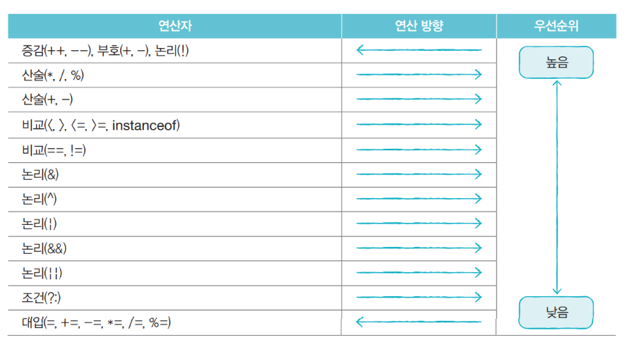 단항 연산자(++, --, ~, !), 부호 연산자(+, -), 대입 연산자(=, +=, -=, ..)는 오른쪽에서 왼쪽 방향으로 연산