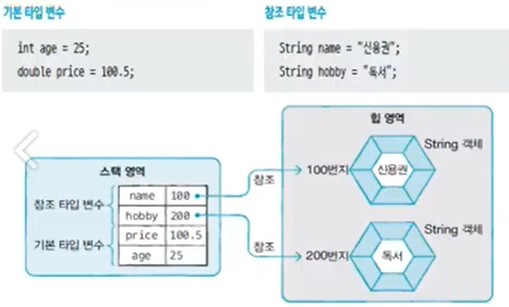 기본 타입은 실제 값을 변수에 저장, 참조타입은 메모리의 번지를 변수에 저장