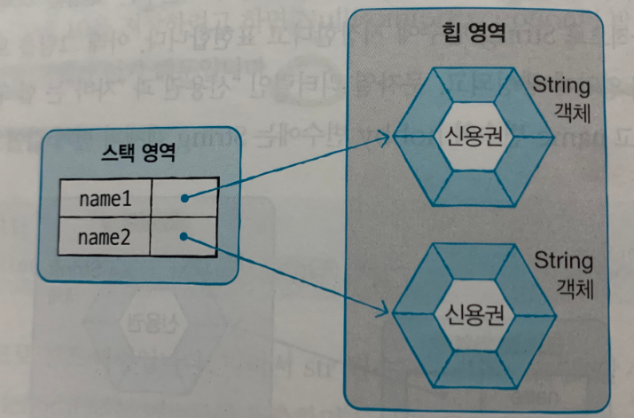 위 코드의 경우 name1과 name2는 서로 다른 String 객체를 참조