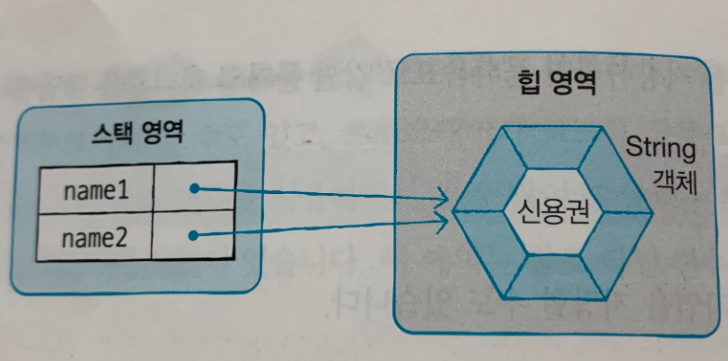 다음과 같이 name1과 name2 변수가 동일한 문자열 리터럴인 "신용권"을 참조할 경우