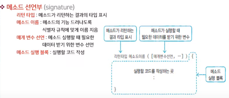 메소드 선언은 선언부( 리턴타입, 메소드 이름, 매개 변수 선언 ) 실행 블록 구성